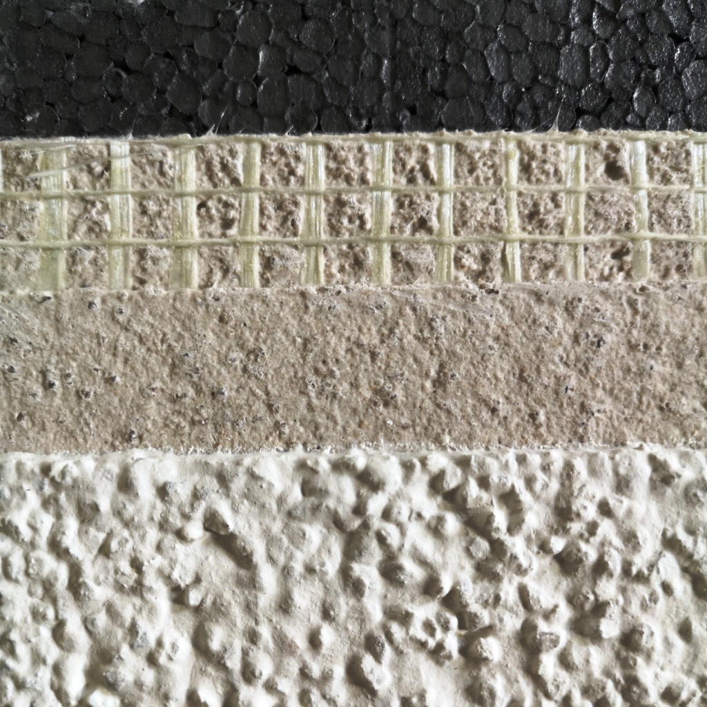 Vollwärmeschutz Wärmedämmverbundsysteme mit verschiedenen Werkstoffen wie Mineralwolle, Polystyrol oder Hanf.